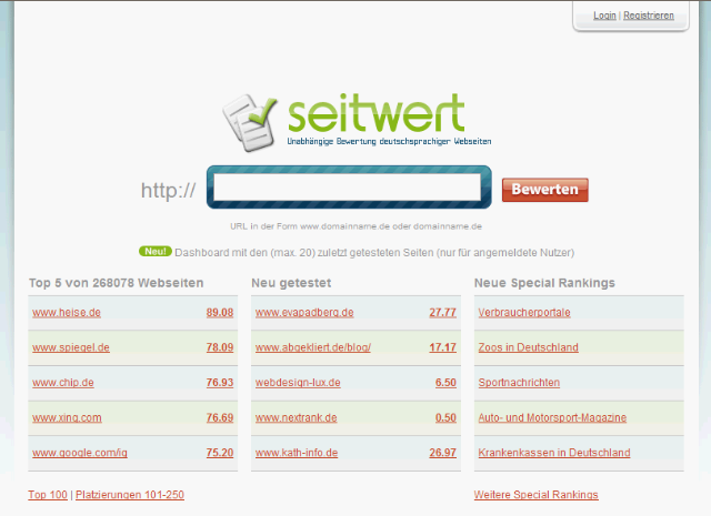 Auf dieser Homepage „Seitwert“ kann man seine Webseite testen lassen und bekommt danach eine Auswertung. Dieser Check kann natürlich keine professionelle Analyse ersetzten aber ist eine gute Sache, um kurz testen zu lassen, was man noch vergessen hat zu optimieren.