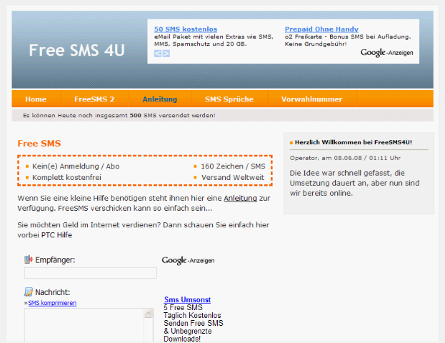 Deshalb habe ich eine kleine FreeSMS Seite geschaffen. Denn was mich bei anderen Homepages immer wieder gestört hatte war, dass sie sehr überladen oder mit Werbung überfüllt waren.