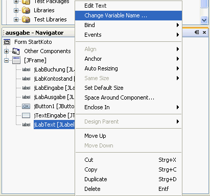 Wenn ihr von einem eurer Labels, Text Feldern etc. den Namen ändern möchtet geht ihr zunächst wieder in den Design Modus. Hier geht in denn in das Inspector Fenster links unten bei Netbeans, dort macht ihr einen rechtsklick auf das jeweilige Text Feld bzw. Label. Hier klickt ihr dann auf Change Variable Name.. in dem fenster was sich anschließend ändert könnt ihr den Namen eurer Variablen anpassen. Mit einem Rechtsklick auf die Variable könnt ihr auch auf Edit Text gehen um den Text welchen ein Label oder eine Textbox anzeigt ändern.