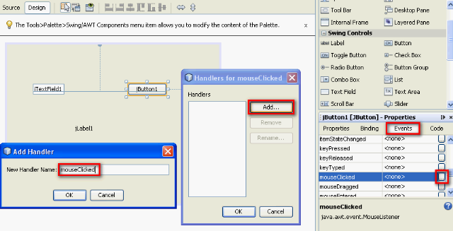 Ihr klickt zunächst auf den Button so das er markiert ist. Danach geht ihr auf der rechten Seite bei den Properties auf “Events”, dort scrollt ihr nach unten bis ihr “mouseClicked” seht. Wenn ihr das gefunden habt klickt ihr auf das … dann öffnet sich das Fenster Handlers for mouseClicked. Hier betätigt ihr den Button Add.. und es geht ein weiteres Fenster auf, hier gebt ihr einen Namen der Funktion an. Ich habe jetzt mouseClicked gewählt. Diese Eingabe bestätigt ihr in beiden Fenstern mit OK. Danach wechselt Netbeans automatisch in den Source Modus und ihr sehr den Code. Euer Courser ist dann auch gleich an der stelle wo die Aktion mit dem Mausklick auf den Button durchgeführt wird. Also alles was ihr dort eingebt wird ausgeführt wenn ihr den Button betätigt.