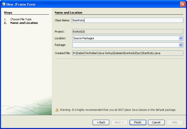 Jetzt seht ihr dieses Fenster dort gebt ihr bei Class Name einen Namen ein wie eure Klasse heißen soll. Ich habe sie jetzt StartKonto genannt.