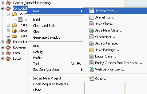 Jetzt macht ihr einen Rechtsklick auf “JFrame Form” wie man es in dem Screenshot sehen kann. Dort wählt ihr en Menupunkt New und klickt dort auf Java Class.