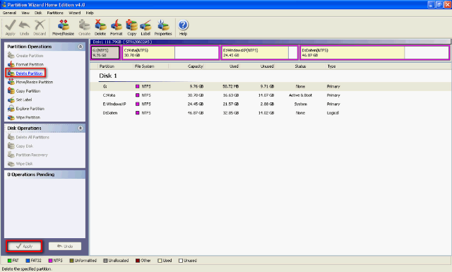 Wenn ihr eine Partition löschen möchtet macht ihr das indem ihr eure gewünschte Partition auswählt und auf Delete Partition klickt. Anschließend seht ihr die Operation in Operation Pending, hier klickt ihr auf den Button Apply und schon wird die Partition gelöscht.