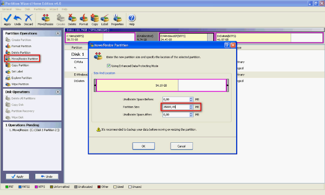 Wenn ihr jetzt den Festplattenspeicherplatz welchen ihr bei der einen Partition entnommen habt einer anderen Partition hinzufügen möchtet wählt ihr wieder die Partition aus. Danach klickt ihr auf Move/Resize Partition. Bei Partition Size könnt ihr dann die neue Größe eingeben welche die Partition haben soll. Wenn ihr das gemacht habt geht ihr wieder bei Operations Pending auf Apply. Wenn ihr an einer Partition etwas ändert welche ihr gerade benützt also z.B. die Partition eures Betriebssystems werdet ihr gefragt ob er den Computer neu starten soll um die Operation aus zu führen. Denn er kann an der Partition nur etwas machen wenn ihr diese gerade nicht benützt. Wenn euer Computer dann neu startet wird Partition Wizard automatisch vor dem Start von Windows gestartet. Hier lasst ihr einfach alles durch laufen und wartet bis euer Computer dann mit Windows startet. Danach hat sich schon die größere eurer Partition geändert.