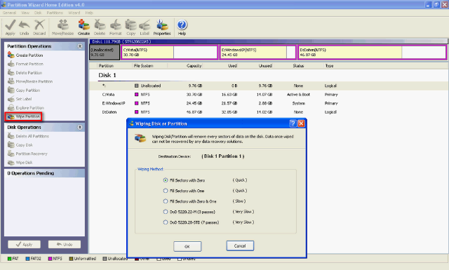 Danach geht ihr auf Wipe Partition damit auch alle Daten welche sich auf der Partition überschrieben werden so das die Daten nicht einfach wieder hergestellt werden können. Hier ist die Frage wie sensibel die Daten sind welche sich auf eurer Partition befinden. Wenn es nicht so geheime Daten sind reicht es wenn ihr Fill Sectors with Zero aus. Das geht am schnellsten, wenn eure Daten aber doch wichtiger sind und sicher gelöscht werden sollen wählt ihr eine Version weiter unten welche aber auch mehr Zeit benötigt, da die Partition mehrmals überschrieben wird.