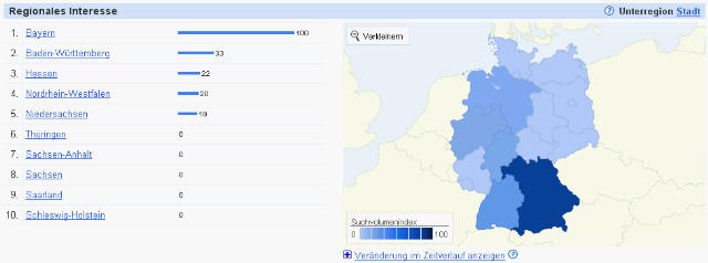 Unter diesem Diagramm seht ihr eine Tabelle mit den Regionalen Interessen und eine Weltkarte. Bei den Regionalen Interessen wird einem angezeigt wie oft das entsprechende Keyword im jeweiligen Land gesucht wird. Wenn wir jetzt z.B. auf das Deutschland klicken sehen wir wie oft der jeweiligen Begriff in welchem Bundesland gesucht wird. Das macht jetzt bei dem Keyword Weihnachten vielleicht nicht so viel sin, aber es gibt Wörter welche in manchen Bunderländern öfter gesucht werden als in anderen. Nehmen wir z.B. den Begriff Bierzelt nach diesem wird z.B. hauptsächlich in Bayern gesucht. Außerdem wird in Baden-Württemberg, Hessen, Nordrhein-Westfalen und Niedersachsen auch danach gesucht. Aber die anderen Bundesländer interessiert dieses Suchwort nicht.