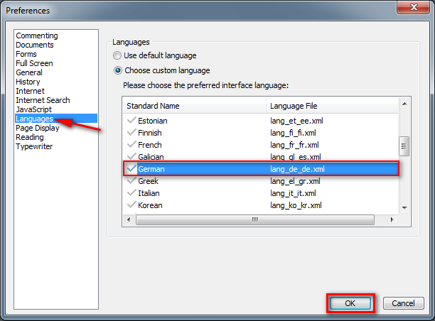 In dem Fenster welches sich dann öffnet wählt ihr den Reiter Language aus und sucht in dem in der Box auf der rechten Seite nach German und wählt es aus. Danach bestätigt ihr das ganze noch mit Ok und schon ist eure Foxit Reader Version auf deutsch.