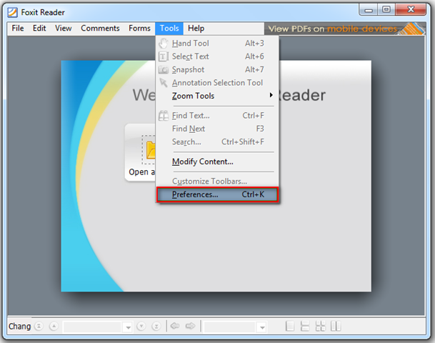 Anschließend startet ihr den Foxit Reader und klickt auf “Tools” und dann auf “Preferences…”.