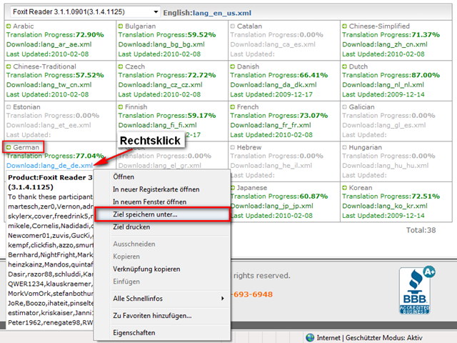 Jetzt schaut ihr nach wo auf der Seite German steht damit ihr das Deutsch Sprachpaket findet. In diesem Feld Macht ihr dann bei “Download:lang_de_de.xml” einen Rechtsklick und klickt auf “Ziel speichern unter …” wenn ihr hier einen anderen Browser als den Internetexplorer benützt könnte diese Funktion etwas anders heißen. Als Speicherort gebt ihr dann euer Foxit Reader Verzeichnis an in dem sich auch eure Foxit Reader.exe befindet.