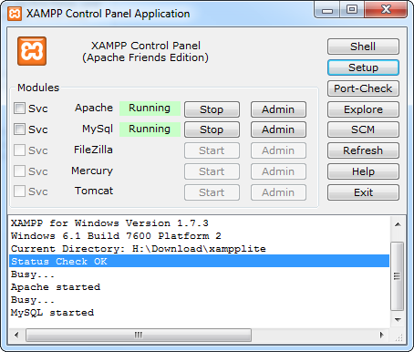 Wenn ihr Xampp dann heruntergeladen habt installiert ihr es oder entpackt das Zip Archiv. Anschließend startet ihr die “setup_xampp.bat” in dem Fenster welches sich dann öffnet befolgt ihr die vorgebenden Schritte. Danach öffnet ihr das Xampp Controll Panel mit einem Doppelklick auf “xampp-control.exe”. Dort startet ihr die Dienste Apache und MySQL und schon läuft euer lokaler Websever und ihr könnt ihr erreichen indem ihr in eurem Browser in der Adresszeile folgendes eingebt:
