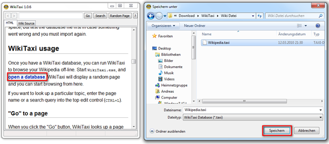 Nachdem euer Importvorgang abgeschlossen ist startet ihr die “WikiTaxi.exe” dort scrollt ihr wie auf dem Screenshot zu sehen zu dem Punkt “WikiTaxi usage”. Bei diesem Abschnitt klickt ihr dann auf “open a database” und wählt eure Datenbank aus welche ihr davor beim Import erzeugt habt.
