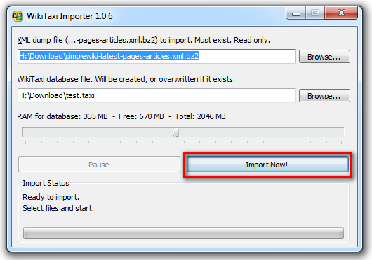 Wenn ihr das Dumpfile heruntergeladen habt startet ihr die “WikiTaxi_Importer.exe” und gebt wie auf dem Screenshot zu sehen ist den Pfad zu eurem Dumpfile ein. Außerdem wählt ihr noch einen Ort aus wo die Datei gespeichert werden soll mit welcher Wiki Taxi später arbeiten wird. Danach klickt ihr auf Import Now, dieser Vorgang kann dann eine ganze Zeit lange dauern