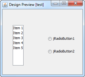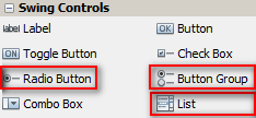Zunächst wählt ihr im Design Modus bei den Swing Controls wie ihr auf dem Screenshot sehen könnt die List bzw. Radio Buttons aus. Diese zieht ihr in eure Java Anwendung und Platziert sie dort wo ihr sie später haben möchtet. Wenn Ihr die Radio Buttons ausgewählt habt müsst ihr noch die Button Group ebenfalls in eure Anwendung hinein ziehen.