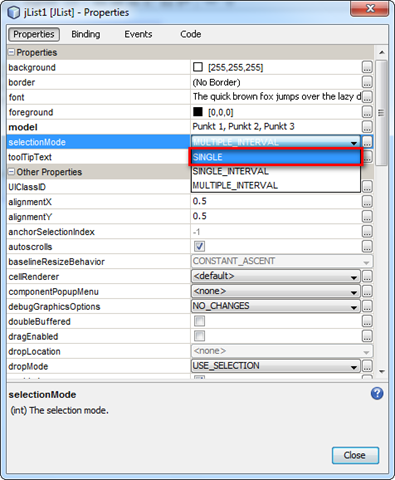 Wenn ihr jetzt möchtet das immer nur ein Listenelement ausgewählt werden kann wählt ihr bei den Properties in der Zeile SelectionMode Single aus. Danach klickt ihr auf den Button Close und eure Liste ist fertig bearbeitet.