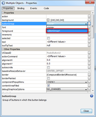 Dort wählt in in der Zeile buttonGroup eure Butten Gruppe aus hier in dem Beispiel heißt diese “buttonGroup1”. Das ganze bestätigt ihr wieder mit dem Close Button, danach sind eure beiden Radio Buttons zu einer Gruppe zusammen gefasst und es kann immer nur einer ausgewählt werden.