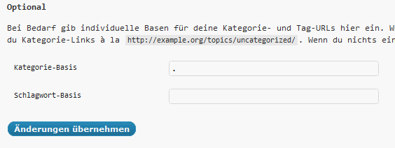 Anstatt dem http://www.domain.de gibt man natürlich die Adresse von der eigenen Webseite an. Nachdem man die Htaccess Datei ediert hat wechselt man wieder in das Admininterface von WordPress und geht dort unter Einstellungen in das Permalinks Menu. Dort gibt man bei dem Textfeld rechts neben “Kategorie-Basis” einfach einen . ein und schon werden die Kategorielinks wie gewünscht nach folgendem Muster dargestellt: