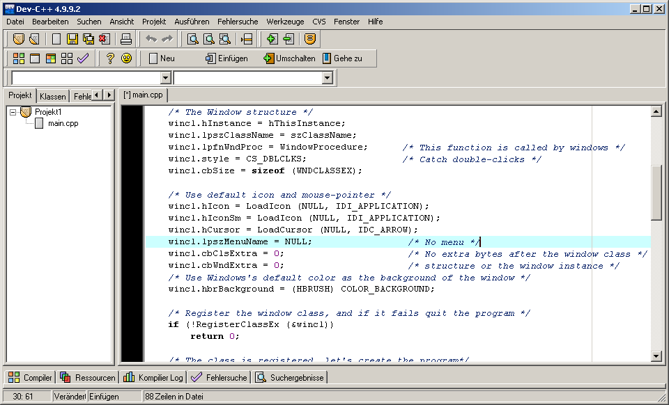 Meine Empfehlung zum Programmieren ist jedoch UNIX/Linux. Dort ist der Kompilierer meist schon vorinstalliert und man kann einfach anfangen. Falls nicht, installiert man das Paket gcc o.Ä. Wer mit Windows arbeiten möchte, kann entweder Visual Studio installieren, welches einen Microsoft-internen Kompilierer mitbringt, oder auf freie Alternativen setzen. Eine ganze UNIX-Umgebung unter Windows, kann man mit cygwin, wie in diesem Artikel beschrieben, installieren. Eine andere Alternative (mit der ich vor Jahren anfing) ist Bloodshed Dev-C++. Dies ist eine komplette IDE welche mit eingebautem Kompilierer geliefert wird – natürlich gratis.