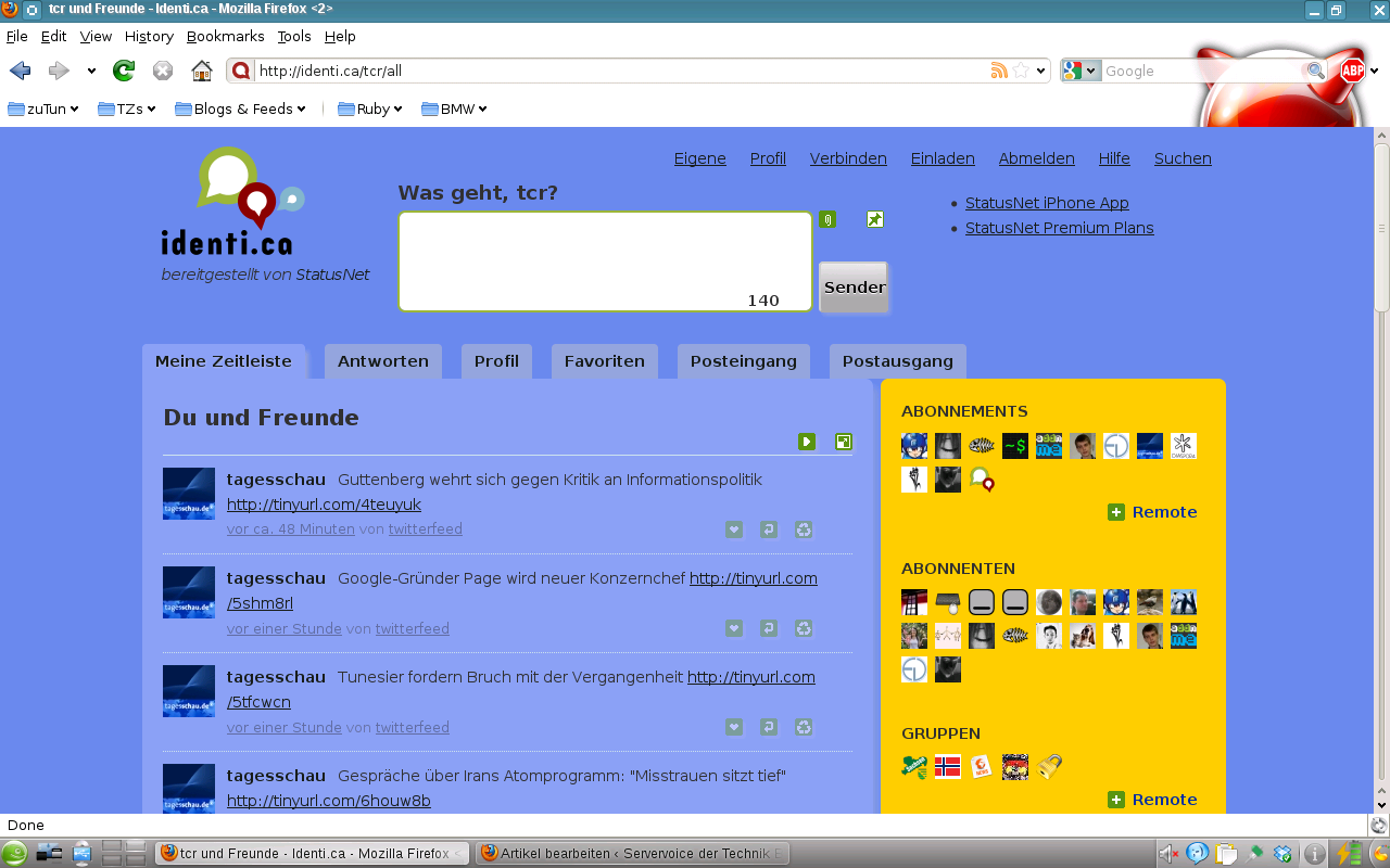 Hierbei handelt es sich um einen Micro-Blogging-Dienst – wie Twitter es ja auch darstellt. Nachdem ich beide ausgiebig getestet habe, muss ich sagen, dass mir identi.ca sogar viel besser gefällt. Zum einen verfügt identi.ca über einen Konversationsverlauf. Dieser zeigt an wer auf was geantwortet hat und macht die ganze Unterhaltung nachvollziehbar. Die neue Twitter-Version verfügt jetzt auch über solch ein Feature, jedoch finde ich das nicht so intuitiv zu lesen – außerdem muss man dazu die recht träge neue Version benutzen.