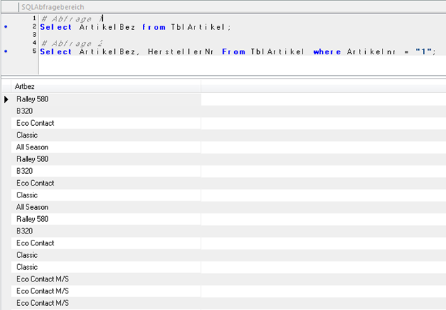 Hier jetzt mal ein Beispiel einer SQL abfrage von der Tabelle TblArtikel mit der man sich die ganzen Artikelbezeichnungen der Tabelle anzeigen lassen kann.